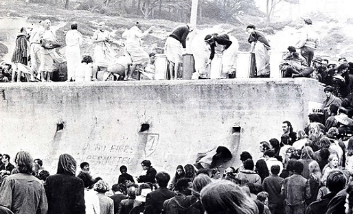 The large steel barrels of food, dozens of watermelons, thousands of “simply wonderfuls” (the name given to a favorite recipe of the devotees by His Divine Grace), as well as other assortments of fine Indian vegetarian foods cooked in savory butter, were already moved to their destination. Everything done in Krishna consciousness is acted through the sanction of higher authorities as revealed in the scriptures. The prasadam was cooked directly from recipes found in Vedic scriptures, and the effort and care taken by the devotee-cooks was primarily for pleasing the transcendental Senses of the Supreme Lord Krishna. All of this food was taken to the Family Dog Auditorium, the site of the feast. Rathayatra Festival is also called the march to the sea. The festival-march was to start at Haight and Ashbury streets and to end at the seaside auditorium.